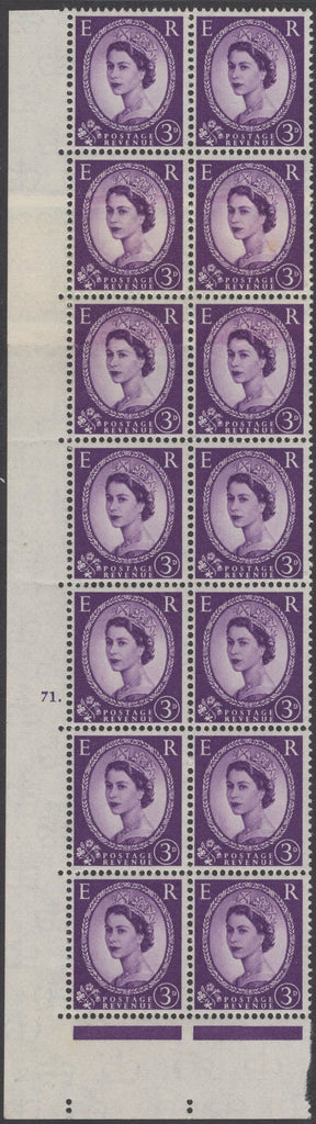 1958 3D DEEP LILAC (SG575) CYLINDER BLOCK OF FOURTEEN VARIETY 'DOUBLE PAPER'. A superb unmounted og lower left corner marginal vertical block of fourteen with cylinder number '71.', very fine 'DOUBLE PAPER' variety affecting four stamps. Fine piece. (Ref 134615).
