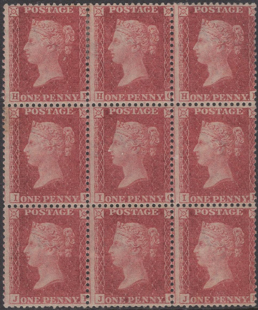 1857 DIE 2 1D PL.36 ROSE-RED ON WHITE PAPER (SG40) MINT BLOCK OF NINE. A good mint block of nine 1857 die 2 1d pl.36 rose-red on white paper (SG40) lettered HF HG HH IF IG IH JF JG JH, centred to right but fine colour. 'J' row light bend but large part original gum and letterings IG IH are missing imprimaturs. (Ref 135064).