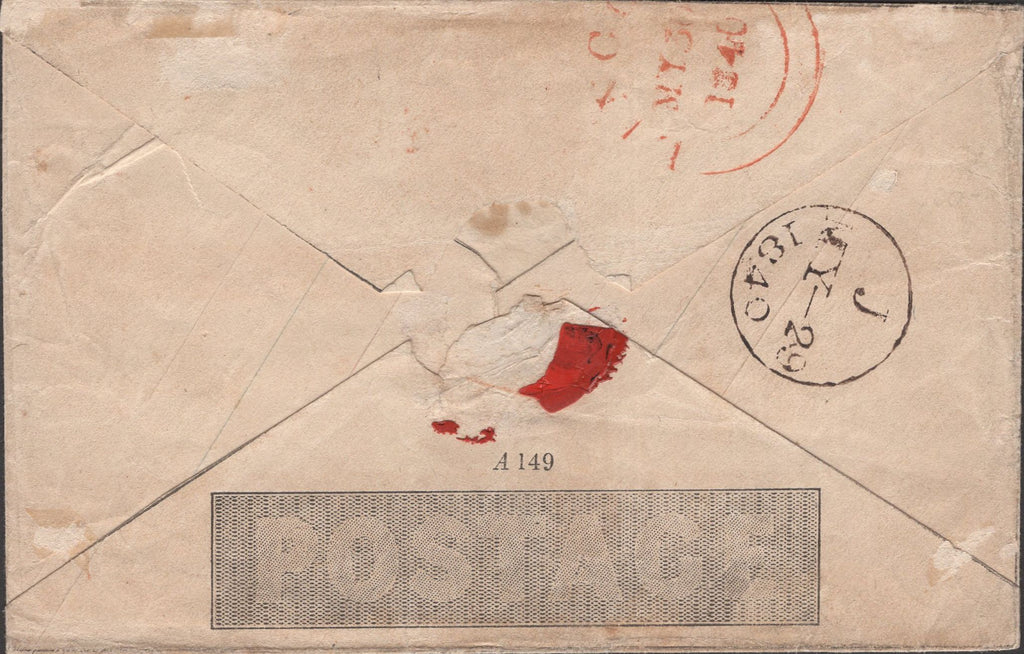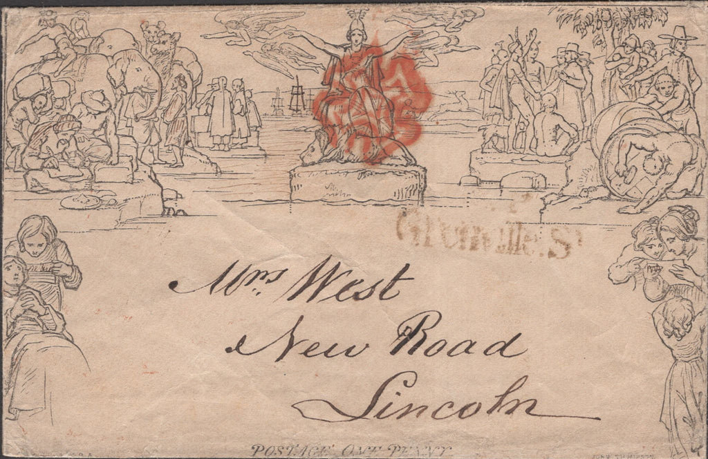1840 1D MULREADY ENVELOPE LONDON TO LINCOLN USED MAY 29TH. Good to fine used 1d Mulready envelope, stereo A149 from London to 'Mrs West, New Road, Lincoln' with fine strike red Maltese cross and on front 'T.P/Grenville.St' receivers handstamp in black. On reverse fine London date stamp MY 29 1840. Slight creasing. (Ref 141348).