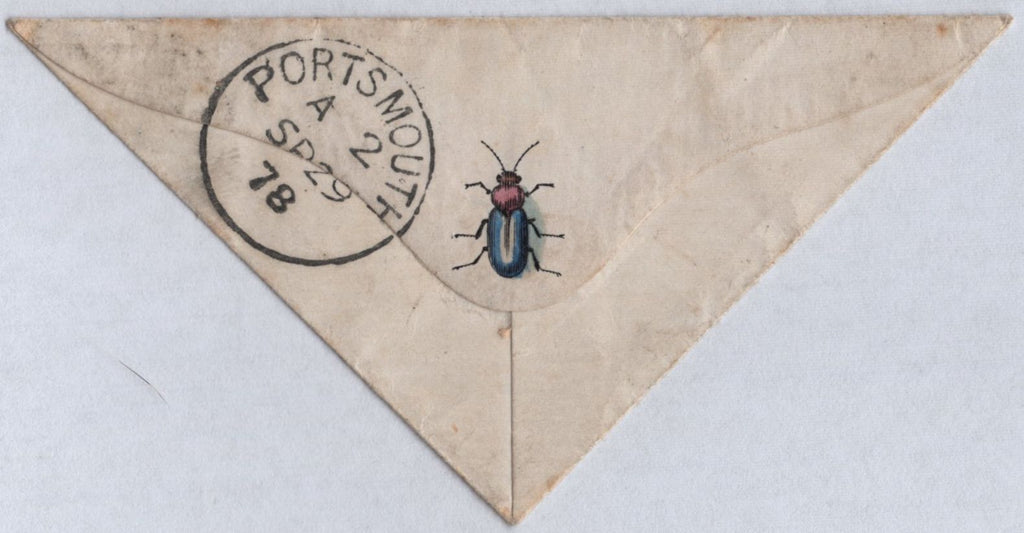 1878 MINIATURE TRIANGULAR ENVELOPE GODALMING, SURREY TO PORTSMOUTH 1D PL.196 (SG43) WITH FINE COLOURED IMAGE OF BEETLE ON REVERSE. A very fine miniature triangular envelope from Godalming to 'Mrs South, 8 Kingston Avenue, Portsmouth, Hants' with fine 1d pl.196 (SG43) lettered BL tied fine strike 'GODALMING/316' duplex SP 29 78. On reverse superb and detailed coloured image of a beetle and alongside 'PORTSMOUTH' date stamp SP 29 78. Scarce and most unusual. (Ref 141996).