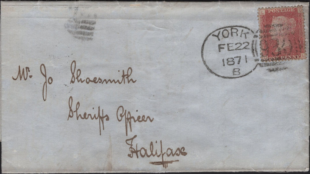 1871 MAIL YORK TO HALIFAX 1D PL.133 (SG43) 'YORK/930' SPOON SECOND RE-CUT (RA138). Wrapper, slight reinforcement, York to 'Mr Jo Shoesmith, Sheriffs Officer, Halifax' with fine 1d pl.133 (SG43) lettered QL tied fine strike 'YORK/930' spoon second re-cut (RA138) FE 22 1871, code 'B'. A rare very rare spoon with Arundel only recording 6 examples. (Ref 142098).
