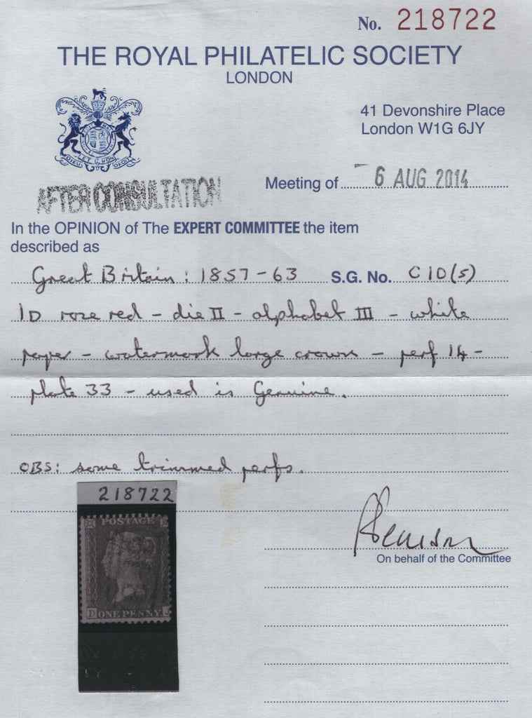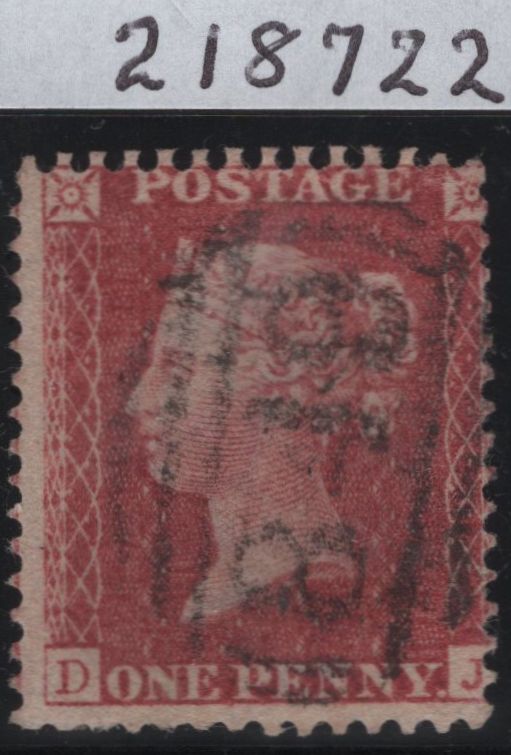 1857 DIE 2 1d PLATE 33 ON WHITE PAPER (SG40)(DJ) GOOD USED. Good used 1857 die 2 1d pl.33 rose-red on white paper (SG40) lettered DJ, several short perforations, cancelled '848' numeral of Warwick. RPS cert 218722 'used is genuine... some trimmed perforations'. Plate 33 rare printing on white paper. Ex-Captain Holland collection. (Ref 84577).