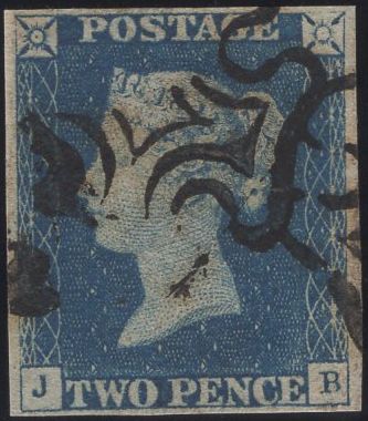 1840 2D BLUE PL.1 (SG5)(JB). Good to fine used 1840 2d blue pl.1 (SG5) lettered JB with four fine margins and cancelled several strikes black Maltese cross. Stamp shows 'HORIZONTAL GUIDELINE THROUGH VALUE' (Spec DS5f). (Ref 134678).