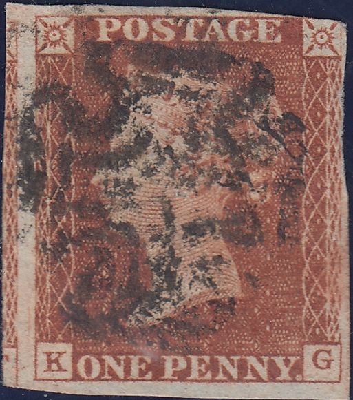 1841 1D RED PL. ELEVEN (SG7)(KG). Used 1841 1d red plate XI (SG7) lettered KG, touched in places cancelled black M.C. Stamp shows fine '7 o'clock ray flaw'. (Ref 111893).