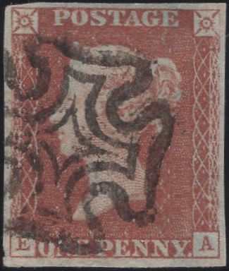 1841 1D RED PLATE TEN (SG7)(EA). Good to fine used 1841 1d red plate ten (SG7) lettered EA, very minor corner bend but four fine margins and cancelled fine strike black Maltese cross. Stamp clearly shows 'O' flaw. (Ref 135356).