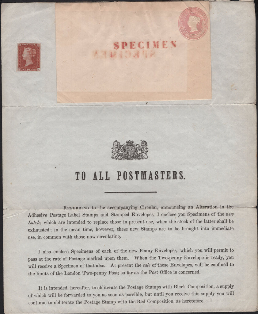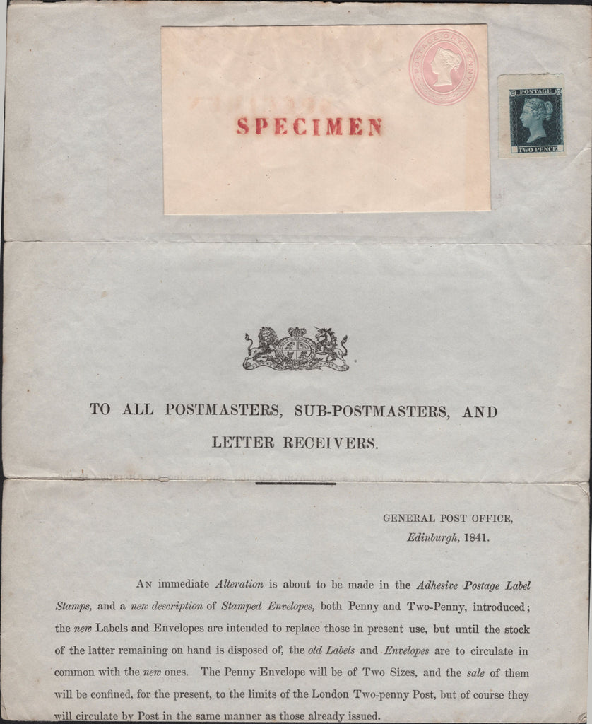 1841 POSTAL NOTICE 'TO ALL POSTMASTERS AND LETTER RECEIVERS' FROM E.S. LEES 'GENERAL POST OFFICE, EDINBURGH' INTRODUCING THE PENNY RED (SG8), THE TWOPENNY BLUE (SG14) AND THE NEW POSTAL STATIONERY (Spec PN8). A fine original example of this very important document comprising two complete A4 sheets, the left sheet introducing the 1841 twopenny blue (SG14) with very fine example 2d proof (DP43) without corner letters. The right sheet introducing the 1841 1d imperf red pl.5 (SG7) lettered FA in state two (Spec AS30a) with four close to fine margins, fine colour and showing the weaker check letter 'A'. Also two examples of the 1d pink envelope overprinted 'SPECIMEN' and unused 'OHMS' envelopes originally used as enclosures. (4 items). Rare and a very important exhibition item. (Ref 141691).