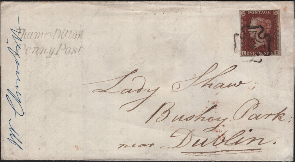 1841 MAIL THAMES DITTON, SURREY TO DUBLIN WITH 1D RED PL. ELEVEN (SG7)(LD) 'Thames Ditton/Penny Post' HAND STAMP (SY615). Fine wrapper from Thames Ditton to 'Lady Shaw, Bushey Park, near Dublin' with very fine 1d red plate eleven (SG7) lettered LD, four fine margins and tied fine strike Kingston Maltese cross in black. On front fine strike 'Thames Ditton/Penny Post' hand stamp in black (SY615) and on reverse 'KINGSTON' date stamp OC 25 1841. Fine usage. (Ref 141963).