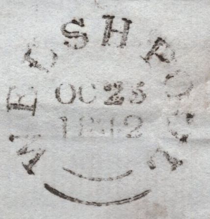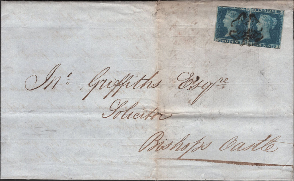 1842 LETTER WELSHPOOL TO BISHOPS CASTLE, SHROPSHIRE WITH PAIR 2D BLUE (SG14) WITH SINGLE MALTESE CROSS CANCELLATION. Letter from Welshpool dated 25 October 1842 to 'Jn. Griffiths Esq. Solicitor, Bishops Castle', with horizontal pair 2d blue (SG14) lettered CH CI, both cut into but tied one good single strike black Maltese cross, contrary to regulations. Creasing clear of stamps. On reverse 'WELSHPOOL' date stamp OC 25 1842. Letter originally contained a 'Draft Agreement'. (Ref 138930).