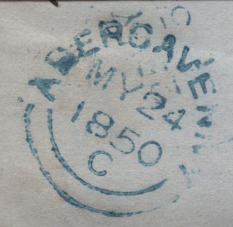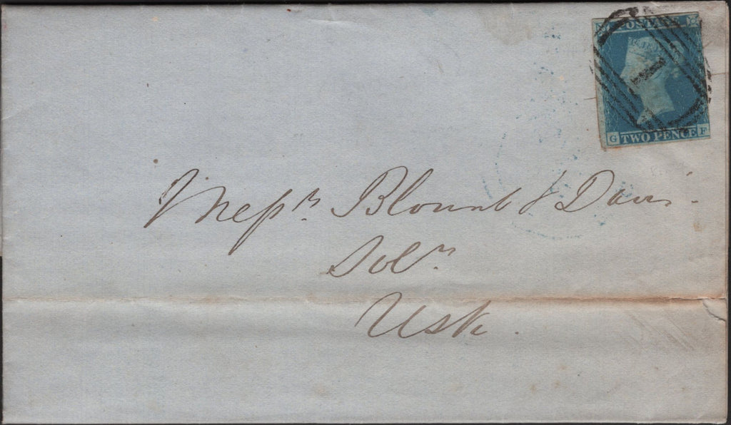 1850 MAIL ABERGAVENNY, MONMOUTHSHIRE TO USK WITH 2D BLUE PL.4 (SG14) '1' NUMERAL OF ABERGAVENNY. Letter from Abergavenny dated 24 May 1850 to 'Mefsrs. Blount and Davies, Solrs., Usk' with 2d blue pl.4 (SG14) lettered GF, touched at right otherwise good margins and tied fine strike '1' numeral of Abergavenny. On reverse 'ABERGAVENNY' date stamp MY 24 1850 in blue. (Ref 138931).