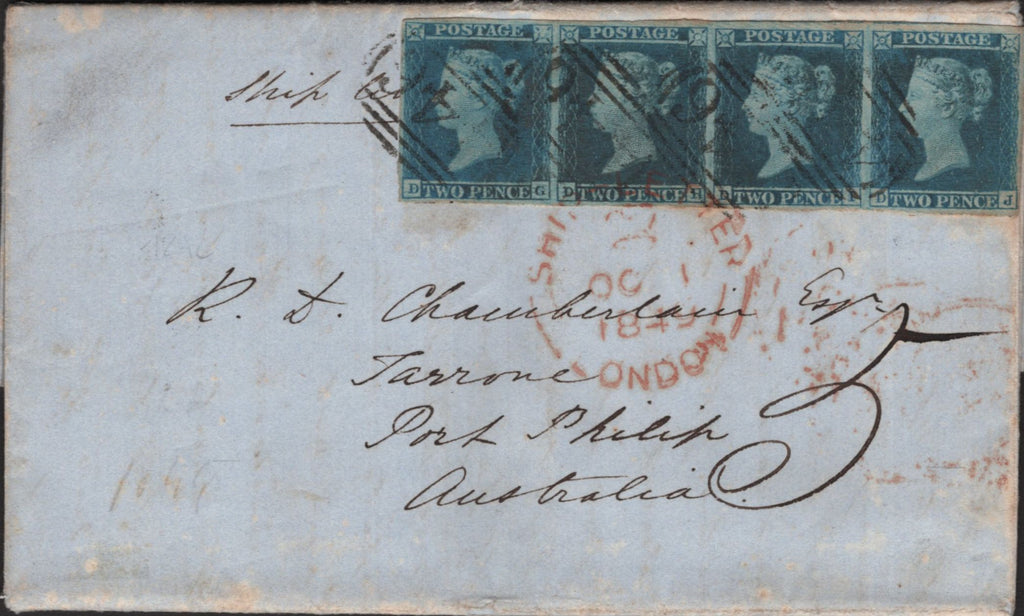 1849 ENTIRE LEDBURY, HEREFORDSHIRE TO PORT PHILIP, AUSTRALIA, FINE STRIP OF FOUR 2D BLUE PL.3 (SG14). Fine entire from Ledbury dated September 1849 to 'R. D. Chamberlain Esq, Tarrone, Port Philip, Australia' with fine to very fine horizontal strip of four 2d blue pl.3 (SG14) lettered DG DH DI DJ. Stamps with very fine margins and tied neat strikes '446' numerals of Ledbury and 'SHIP LETTER/CROWN/LONDON' date stamp OC 1 1849. Stamps paying the 8d private ship rate. On reverse 'LEDBURY' date stamp SP 29 1849. A very fine usage. (Ref 140887).