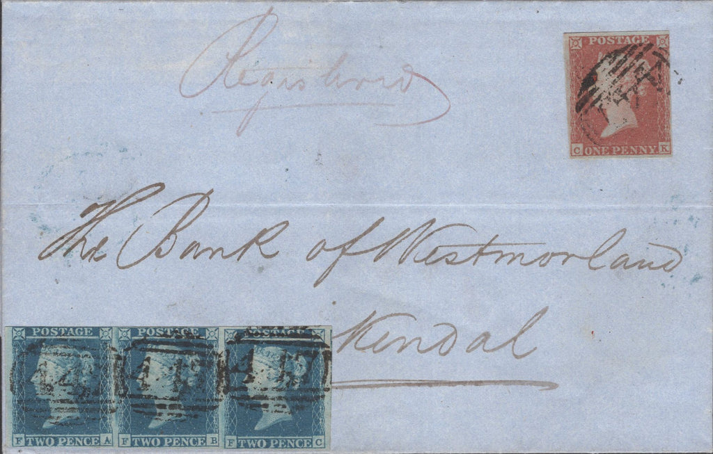 1850 REGISTERED MAIL LEEDS TO KENDAL WITH 1D IMPERF (SG8) AND STRIP OF THREE 2D BLUE (SG14). Fine wrapper sent registered mail from Leeds to 'The Bank of Westmorland, Kendal' with find 1d imperforate (SG8) lettered CK and good to fine horizontal strip of three 2d blue pl.4 (SG14) lettered FA FB FC, several very close/touched in places, stamps cancelled '447' numerals of Leeds. Penny red paying postage and blues paying 6d registration fee. On reverse 'LEEDS' date stamp NO 28 1850 and 'KENDAL' date stamp NO 29 1850. Fine usage. (Ref 141384).