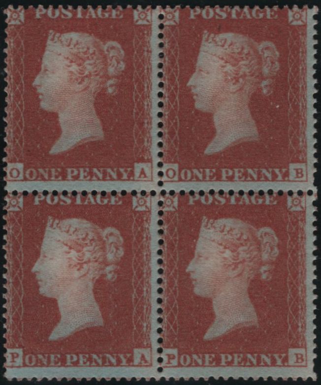 1850 1D PL.98 ARCHER EXPERIMENTAL PERFORATION (SG16b) EXCEPTIONAL UNMOUNTED MINT BLOCK OF FOUR. An exceptional unmounted o.g. block of four 1850 1d pl.98 ARCHER EXPERIMENTAL PERFORATION (SG16b) lettered OA OB PA PB with superb colour. Block shows unusual but consistent perforations at lower right of both right hand stamps. A quite superb block of exhibition quality. (Ref 141877).