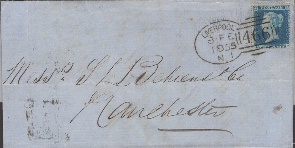 1855 MAIL LIVERPOOL TO MANCHESTER 2D BLUE PL.4 (SG19) 'LIVERPOOL/466' SPOON TYPE B1 (RA55). Fine letter Liverpool to 'Messrs F L Behrens and Co, Manchester' with 2d blue pl.4 (SG19), corner fault lower right, tied very fine strike 'LIVERPOOL/466' spoon type B1 (RA55) 8 FE 1855 code 'N'. (Ref 141376).