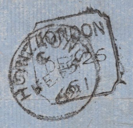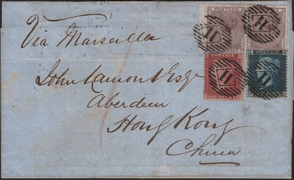 1861 THREE COLOUR COMBINATION LONDON TO HONG KONG, CHINA WITH 1D (SG40), 2D (SG45) AND 6D (SG69). Letter from London to 'John Lamont Esqr, Aberdeen, Hong Kong, China' endorsed 'Via Marseilles', small part letter missing inside, with die 2 1d rose-red on white paper (SG40) lettered DE, 2d blue pl.9 (SG45) and 6d lilac (SG69) x 2, all tied neat strikes London '11' Inland Office numerals. On reverse 'LONDON' date stamp DE 26 61 and 'HONG KONG' date stamp FE 15 62. Attractive and rare usage with Holcombe certificate. (Ref 141098).