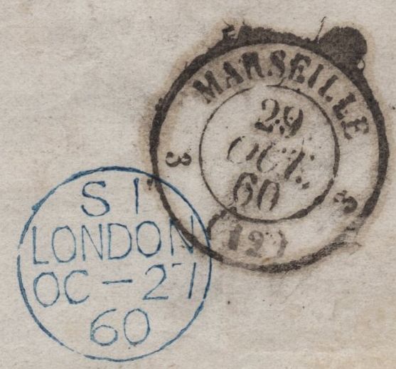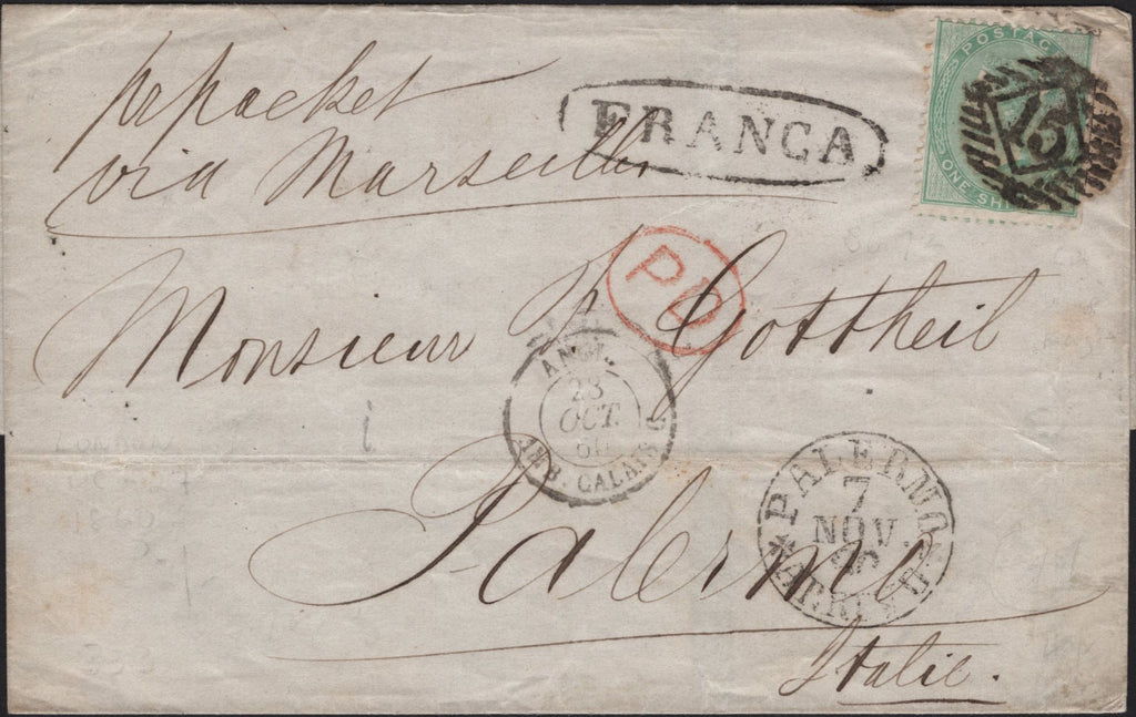 1860 MAIL LONDON TO PALERMO, ITALY 1S PALE GREEN (SG73). Wrapper London to Palermo, Italy with 1s pale green (SG73), two toned perforations and wing margin trimmed at right, tied fine strike London '15' Inland Office numeral. On front fine strikes 'PD' oval hand stamp in red, oval 'FRANCA' hand stamp in black and 'PALERMO' date stamp 7 NOV 60. On reverse 'MARSEILLE' date stamp 29 OCT 60. (Ref 142004).