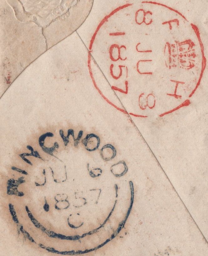 • 142065 1857 MAIL RINGWOOD, HANTS TO CEYLON, THREE COLOUR COMBINATION INCLUDING 6D DEEP LILAC ON 'AZURE' BLUED PAPER (SG69a).