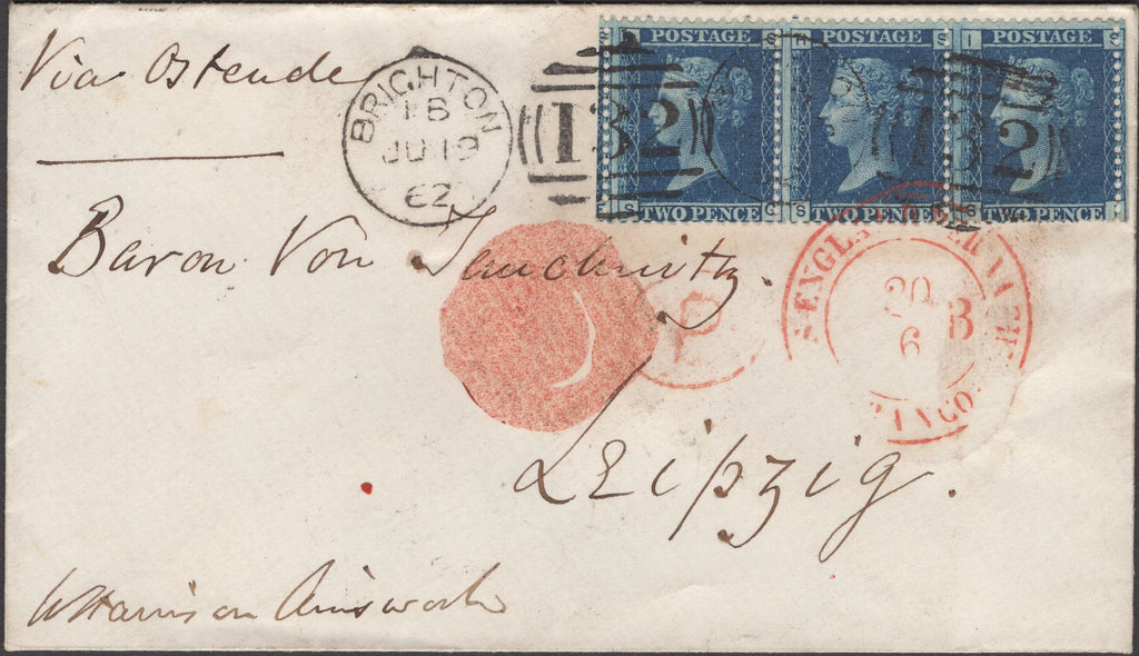 1862 MAIL BRIGHTON TO LEIPZIG WITH STRIP OF THREE 2D BLUE PL.9 (SG45). Fine envelope from Brighton to 'Baron Von Tauchnitz, Leipzig' 'Via Ostende' with strip of three 2d blue pl.9 (SG45) lettered SG SH SI, several short perforations, tied fine strikes 'BRIGHTON/132' duplex JU 19 62. Also on front 'AACHEN' transit date stamp and oval 'P' hand stamp. On reverse German receiver. Attractive usage. (Ref 135167).