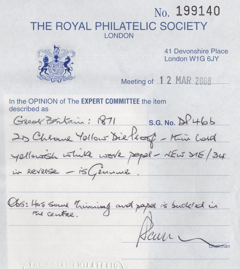 1871 2D BLUE DIE PROOF CHROME-YELLOW ON THIN WHITE WOVE PAPER ENDORSED 'NEW DIE/34' (SPEC DP46b). A fine to very fine 1871 2d blue die proof in CHROME-YELLOW on thin white wove paper endorsed 'NEW DIE/34' (SPECDP46b). RPS Cert 'is genuine.... some thinning and paper buckled', nevertheless and most attractive and very rare proof, the first example we can recall seeing. Ex Royal Collecton. (Ref 141369).