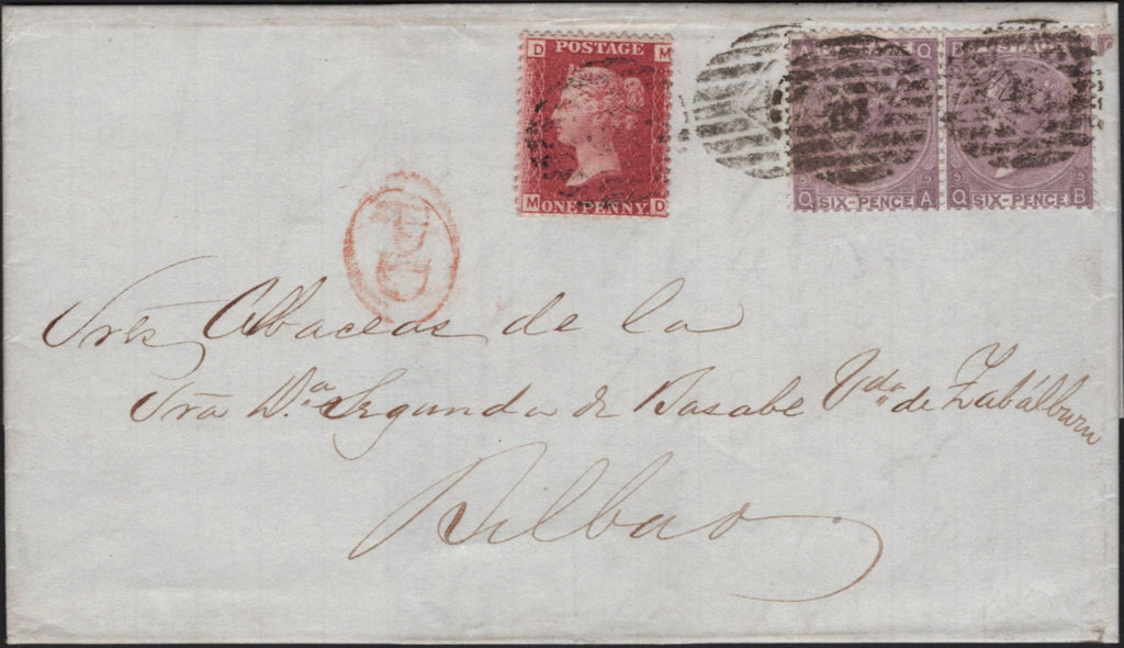 1866 MAIL LONDON TO BILBAO, SPAIN WITH 1D (SG43) AND PAIR 6D LILAC (SG97) WITH 1D LATE FEE. Fine letter from London dated 22nd Feb 1866 to Bilbao with fine 1d pl.79 (SG43) lettered MD and good to fine pair 6d lilac (SG97) lettered QA QB tied London '46' numerals and on front good strike oval 'PD' Paid to Destination hand stamp in red. Stamps paying 1s postage and 1d late fee. (Ref 141610).