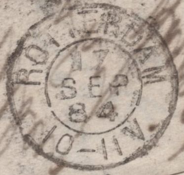 1884 MAIL LONDON TO ROTTERDAM WITH 2½D LILAC (SG190) X 3 PAYING TRIPLE RATE AND 1D LILAC (SG172) LATE FEE. Fine wrapper from London to 'Messrs. J. Lanning and Sons, Rotterdam, Holland' with 2½d lilac (SG190) x 3 paying triple UPU rate lettered KD HA and HD with 1d lilac paying late fee. Stamps tied fine strikes 'L.1/MARK LANE/ML/1' duplexes SP 16 84. Filing fold affects 1d lilac. On reverse 'ROTTERDAM' date stamp 17 SEP 84. Good usage. (Ref 141631).