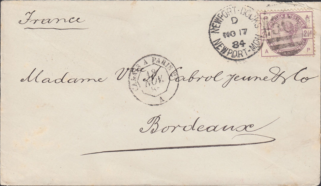 1884 MAIL NEWPORT DOCKS TO FRANCE. Envelope Newport to Bordeaux with fine 2½d lilac (SG190) tied fine strike NEWPORT.DOCKS/NEWPORT-MON/561 duplex NO 17 84, also on front CALAIS A PARIS French railway date stamp 18 NOV 84. Very clean and attractive usage. (Ref 112819).