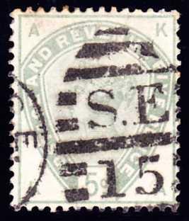 1883 5d green WITH PLUG FLAW (SG 193Var). A good used example lettered KA with reasonable colour cancelled 'SE15' London duplex with plug flaw on 'A' at lower right.  (Ref 40090).