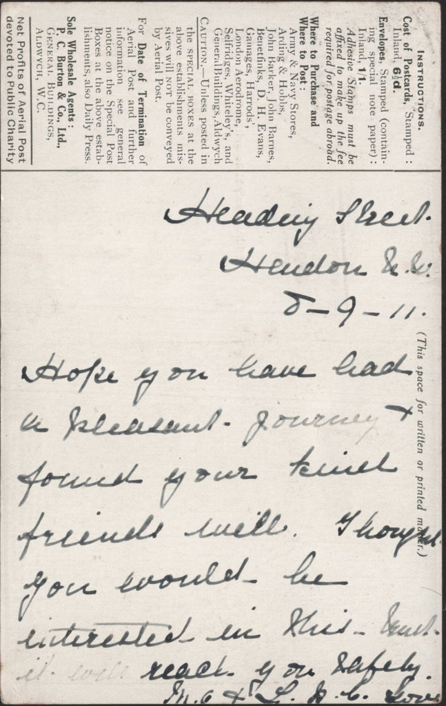 1911 FIRST U.K. AERIAL POST, VERY FINE LONDON POSTCARD IN OLIVE-GREEN, POSTED 'HENDON' WITH VERY FINE STRIKE HANDSTAMP DIE '5'. Very fine London postcard in olive-green to Hungerford with KGV ½d tied very fine almost complete strike 'FIRST UNITED KINGDOM/AERIAL POST LONDON' date stamp SP 9 1911 with the very scarce die '5'. On reverse manuscript posted at 'HENDON' 'AERODROME' . (Ref 140753).