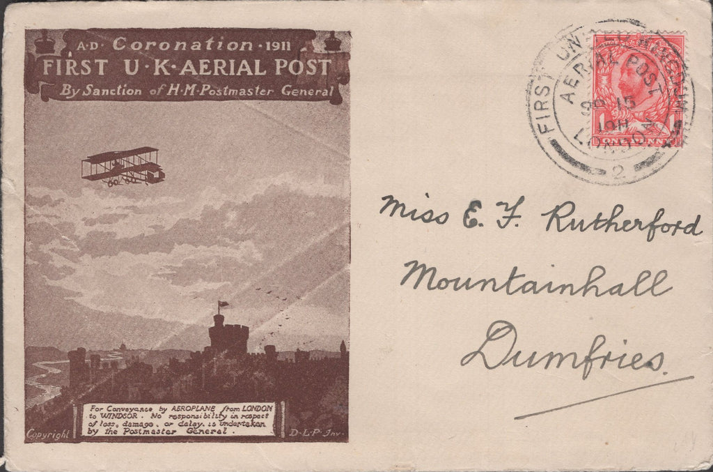 1911 FIRST U.K. AERIAL POST LONDON EMERGENCY ENVELOPE IN DARK BROWN LONDON TO DUMFRIES. Good to fine London emergency envelope in dark brown, small tear at left from London to 'Miss E.F. Rutherford, Mountainhall, Dumfries' with KGV 1d Downey tied good strike 'FIRST UNITED KINGDOM/AERIAL POST/LONDON' date stamp SP 15 1911 Die 2. With insert and additional note, on 'DUMFRIES' date stamp SP  26 11. (Ref 141268).