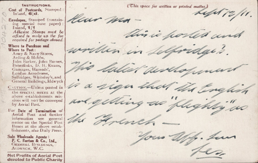 1911 FIRST U.K. AERIAL POST LONDON POSTCARD REPRINT IN BROWN TO ACTON. Fine London postcard 'reprint' with imprint at upper right higher setting than the original printing, in brown to Acton with KGV ½d Downey tied fine strike 'FIRST UNITED KINGDOM/AERIAL POST/LONDON' date stamp SP13 1911 Die 1. Crease but fine message 'this is posted and written in Selfridge's. This latest development is a sign that the English are getting as 'flighty' as the French'. (Ref 141281).