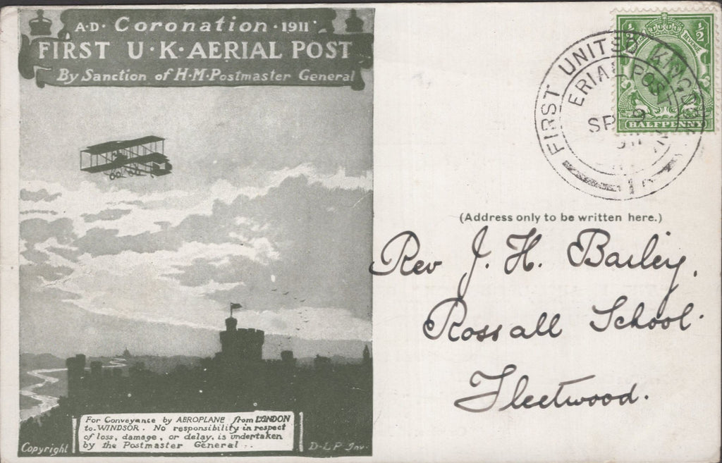 1911 FIRST U.K. AERIAL POST LONDON POSTCARD IN OLIVE-GREEN TO FLEETWOOD WITH 'THE FINANCIAL OUTLOOK' ADVERT. Fine London postcard in olive-green to 'Rev J.H. Bailey, Rossall School, Fleetwood', with KGV ½d Downey tied good strike 'FIRST UNITED KINGDOM/AERIAL POST/LONDON' date stamp SP 9 1911 Die 1. On reverse fine printed advert 'THE FINANCIAL OUTLOOK' in green. (Ref 141293).