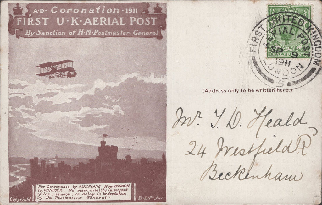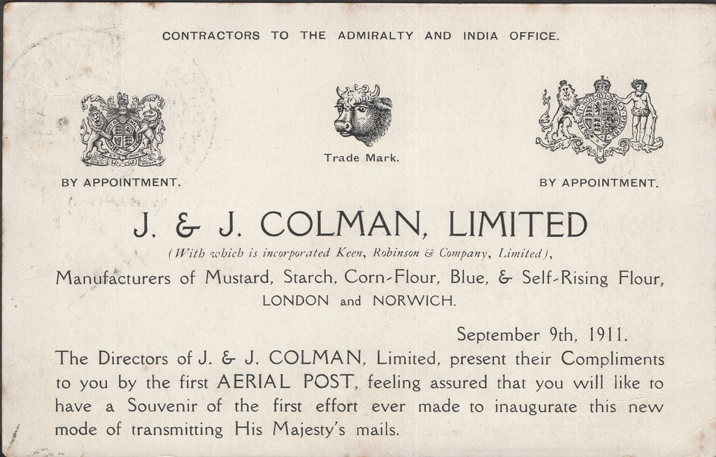 1911 FIRST U.K. AERIAL POST LONDON POSTCARD IN BROWN TO BECKENHAM, KENT WITH 'J. and J. COLMAN' ADVERT. Good London postcard in brown, several tone spots, to Beckenham, Kent with KGV 1/2d Downey tied fine strike 'FIRST UNITED KINGDOM/AERIAL POST/LONDON' date stamp SP 9 1911, with the much scarcer Die 5. Dies '5' and '6' were only struck on mail handed in at Hendon Aerodrome. On reverse fine 'J. and J. COLMAN, LIMITED' printed advert. (Ref 141294).