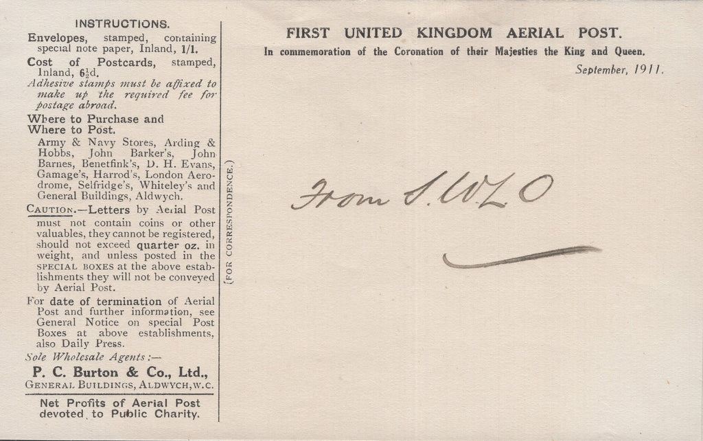 1911 FIRST U.K. AERIAL POST LONDON EMERGENCY ENVELOPE IN OLIVE-GREEN TO OFFICES OF THE AERIAL POST, ALDWYCH, LONDON. Used London emergency envelope plus insert in olive-green addressed 'c/o Offices Aerial Post, General Buildings, Aldwych, London W.C' with KGV 1d Downey tied fine large part strike 'FIRST UNITED KINGDOM/AERIAL POST/LONDON' date stamp SP 14 1911 Die 1. Tone spots affect envelope and stamp. (Ref 141299).