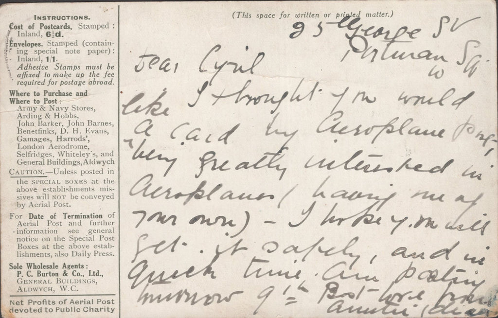 1911 FIRST U.K. AERIAL POST LONDON POSTCARD OLIVE-GREEN TO BEDFORD. Good used London postcard in olive-green, some creasing, to Bedford with KGV ½d Downey cancelled good strike 'FIRST UNITED KINGDOM/AERIAL POST/LONDON' date stamp SP 9 1911 Die 1. Message reads 'I thought you would like a card by Aeroplane post, being greatly interested in Aeorplanes (having one of your own)...... '. (Ref 141309).