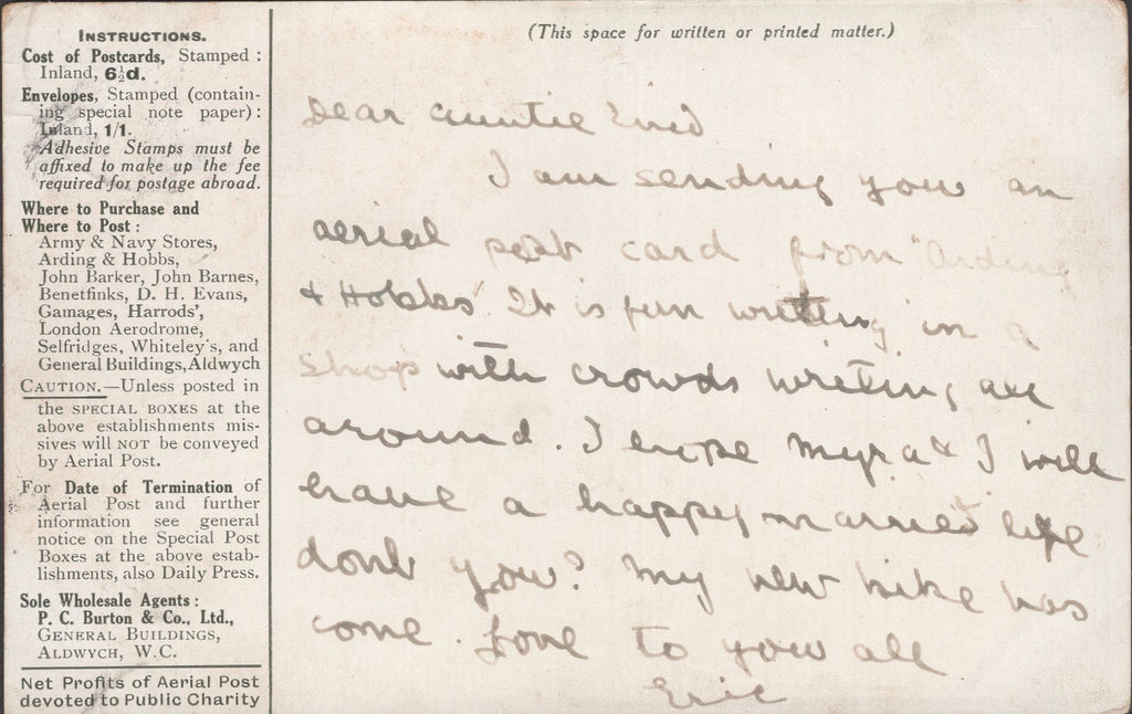 1911 FIRST U.K. AERIAL POST LONDON POSTCARD IN OLIVE-GREEN TO LEAMINGTON SPA, POSTED FROM 'ARDING AND HOBBS'. Fine London postcard in olive-green to Leamington Spa, Warwick, with KGV ½d Downey tied part strike 'FIRST UNITED KINGDOM/AERIAL POST/LONDON' date stamp SP9 1911 Die 1. Message reads 'I am sending you an aerial postcard from Arding and Hobbs'. It is fun writing in a shop with crowds writing all around .........'. Stamp with fault. (Ref 141310).