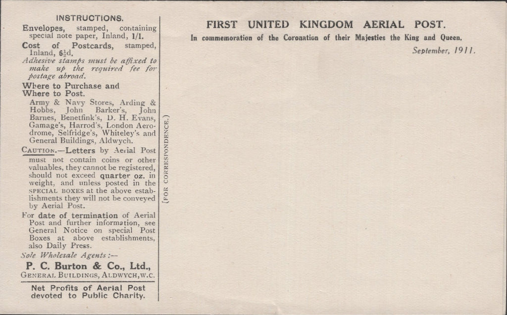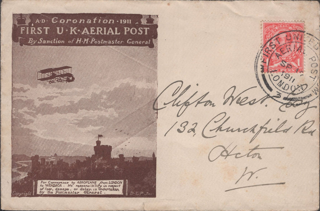 1911 FIRST U.K. AERIAL POST LONDON EMERGENCY ENVELOPE IN DARK BROWN TO ACTON. Good London emergency envelope in dark brown with insert, minor imperfections, to 'Clifton West Esq, 132 Churchfield Rd, Acton' with KGV 1d Downey tied fine large part strike 'FIRST UNITED KINGDOM/AERIAL POST/LONDON' date stamp SP 14 1911 Die 3. (Ref 141319).