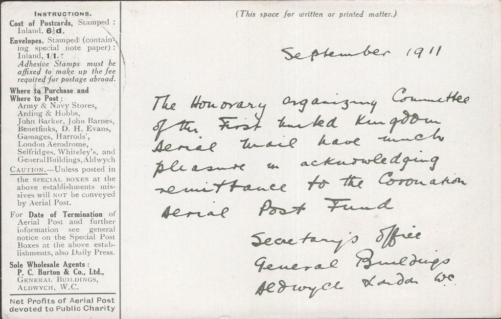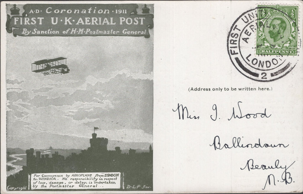 1911 FIRST U.K. AERIAL POST LONDON POSTCARD IN OLIVE-GREEN TO BEAULY, SCOTLAND. Very fine London postcard in olive-green to 'Miss J Wood, 'Ballindoun, Beauly, N.B.' with KGV ½d Downey good strike 'FIRST UNITED KINGDOM/AERIAL POST/LONDON' date stamp SP 9 1911 Die 2. Card sent by Organisisng Committee on behalf of the sender. (Ref 141330).
