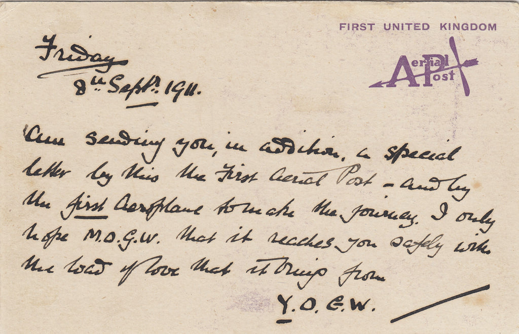 1911 FIRST OFFICIAL U.K. AERIAL POST LONDON PRIVILEGE POSTCARD IN VIOLET LONDON TO GT. MISSENDEN, BUCKS. A very fine example of the scarce London privilege postcard in violet to 'Mrs C. Aston Denyer, The Den, Prestwood, Gt. Missenden, Bucks' with KGV ½d Downey tied fine strike 'FIRST UNITED KINGDOM/AERIAL POST LONDON' date stamp SP 9 1911 Die 1. Fine message on reverse 'Am sending you in addition, a special letter by this the First Aerial Post - and by the first Aeroplane to make the journey .......'. (Ref 141485).