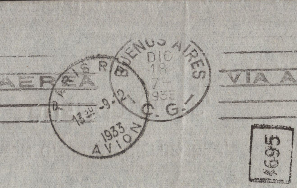 1933 AIR MAIL LONDON TO BUENOS AIRES, ARGENTINA WITH FINE 2/6 SEAHORSE (SG415a) AND KGV 9D (SG427) X 2. Fine envelope, 230 x 105mm, sent air mail London to Buenos Aires, Argentina with fine 2/6 Bradbury Wilkinson (SG415a) and fine pair 9d olive green (SG427) with London cancellations 8 DEC 1933. Stamps paying 4s single letter rate via France. On reverse 'PARIS' and 'BUENOS AIRES' date stamps. (Ref 141886).