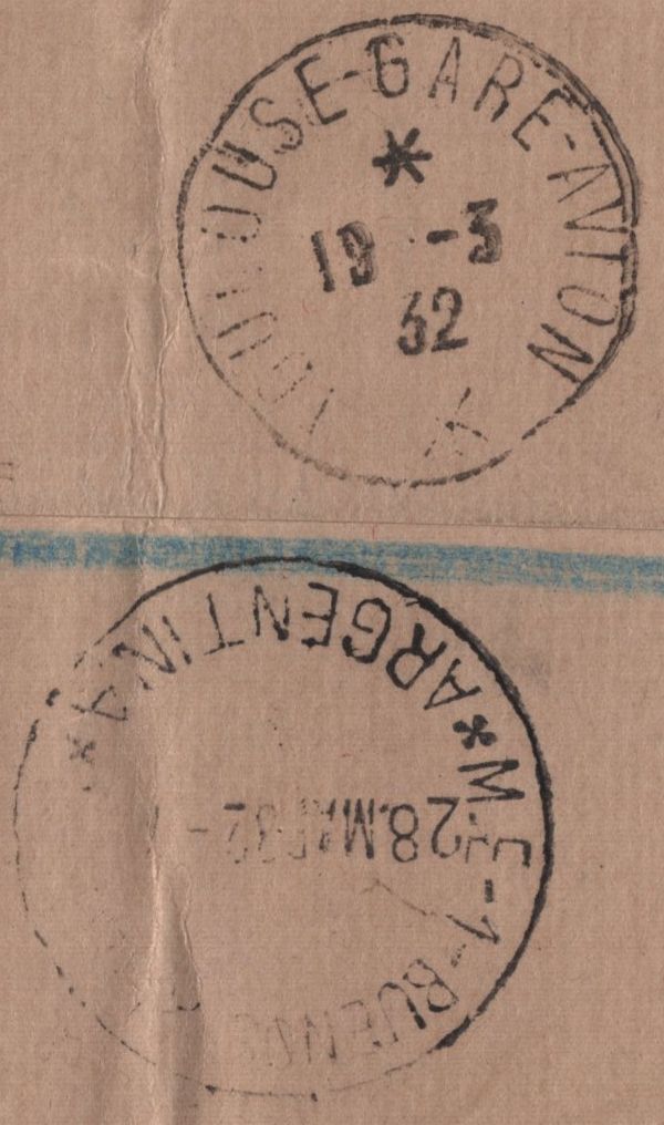 1932 REGISTERED AIR MAIL MIDDLESBROUGH, YORKS TO BUENOS AIRES, ARGENTINE WITH 5S SEAHORSE (SG416), 3D AND KGV 1S X 3. Envelope sent registered air mail Middlesbrough, Yorks to Buenos Aires, Argentine with fine 5s Seahorse Bradbury Wilkinson (SG416), KGV 3d (SG423) and 1s bistre-brown (SG429) x 3 with light strikes 'MIDDLESBROUGH/YORKS' date stamp 12 MR 32. On reverse 'TOULOUSE' and 'BUENOS AIRES' date stamps. Fine registered usage. (Ref 141891).