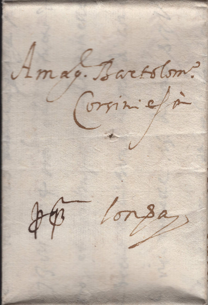 1595 CORSINI MAIL FROM FLORENCE TO LONDON. Fine entire letter from Franco Alessandro in Firenze dated 18th November 1595 TO Bartolomeo Corsini in London and endorsed 'pq' implying that the recipient will pay postage. Fine usage. (Ref 142143.)