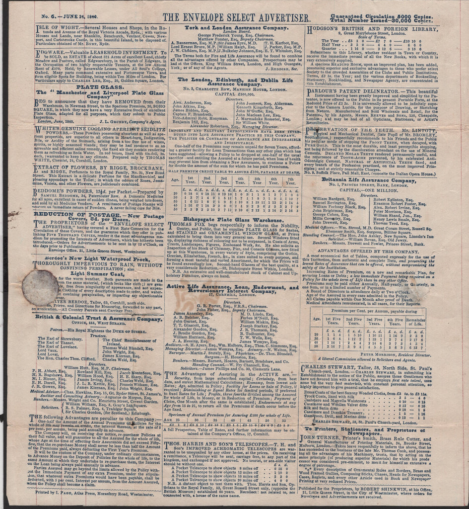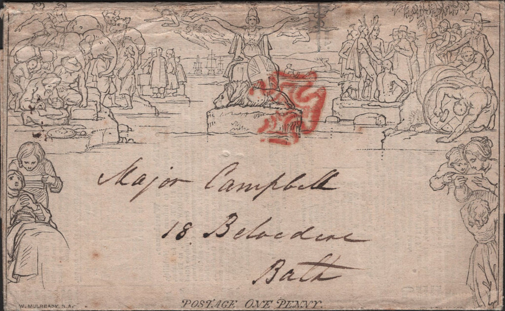1840 1D MULREADY WRAPPER LONDON TO BATH WITH 'THE ENVELOPE SELECT ADVERTISER' 'No.6 JUNE 24 1840' (SPEC MA10f). A good to fine used 1d Mulready wrapper, stereo A66, from London to 'Major Campbell, 18 Belvedere, Bath', small tear at top and slight soiling, good strike red Maltese cross and on reverse London date stamp AU 21 1840. Within fine 'THE ENVELOPE SELECT ADVERTISER' 'No.6 JUNE 24 1840' printed in a deeper shade (Spec MA10f). Fine advert 'ISLE OF WIGHT.- Several House and Shops, in the Rotunda and Avenue of the Royal Victoria Arcade, Ryde... to be disposed of'; 'EDGEWARE.- Valuable LEASEHOLD INVESTMENT. To be SOLD, an ESTATE of some 375 Acres of excellent Land... called Edgewarebury, in the Parish of Edgeware...'; 'PLATE GLASS. The 'Manchester and Liverpool Plate Glass Company'...'; 'WHITE'S GENUINE COOLING APERIENT SEIDLITZ POWDERS.- These Powders... are superior to all others in Heart-burn, Indigestion, Bile, or Acidity of the Stomach, arising from a too free use of wines, spirits or highly seasoned viands...'; 'EXTRACT OF FLOWERS BY RIGGE, BROCKBANK and RIGGE. Perfumers to the Royal Family...'; 'BEDDOME'S POWDERS... A Domestic Medicine... excellent in cases of sudden illness...'; 'REDUCTION OF POSTAGE.- New Postage Covers, 8d per Dozen. THE PROPRIETORS of the 'ENVELOPE SELECT ADVERTISER' having secured a First Rate Connection for the Circulation of these Covers, and the guarantee which they offer in publishing FIVE THOUSAND COPIES, render it the most advantageous medium for promoting the Interests of Advertisers...'; 'Berdoe's New Light Waterproof Frock...'; 'British and Colonial Trust and Assurance Company...'; 'York and London Assurance Company...'; 'The London, Edinburgh, and Dublin Life Assurance Company...'; 'Bishopsgate Plate Glass Warehouse. THOMAS FOX begs respectfully to inform the Nobility, that he supplies PLATE GLASS... and STAINED and ORNAMENTAL WINDOW GLASS... in every variety of Style, comprising the Gothic, Grecian, Elizabethan, French etc etc...'; 'Active Life Assurance, Loan, Endowment, and Reversionary Interest Company...'; 'THOS. HARRIS AND SON'S TELESCOPES... IMPROVED ACHROMATIC TELESCOPES... A Pocket Telescope to show objects 8 miles off, A Pocket Telescope to show objects 12 miles off...'; 'HODGSON'S BRITISH AND FOREIGN LIBRARY... Scale of Terms. The Year...£5 5 0, Half Year £3 3 0, Quarter £1 16 0...'; 'PARLOUR'S PATENT DELINEATOR-... It is universally allowed to be infinitely superior to the Camera Lucida, for the purpose of Drawing, or Sketching from Nature...'; 'PRESERVATION OF THE TEETH. MR LINTOTT... peculiar mode with PURE GOLD...'; 'Britannia Life Assurance Company...'; 'CHARLES STEWART, Tailor... Dress Coats... Frock Coats... Cashmere and Marcella Waistcoats... Silk and Satin Waistcoats... Cassimere and Doeskin Trousers... Gambroon, Drill, and Merino...'; 'To Printers, Stationers, and Proprietors of Newspapers... JOHN TURNER, Printer's Smith, Brass Rule Cutter... has succeeded to the business of the late Mr. Thomas Cook...'. A very fine advert with three unused examples and ten used recorded to date. (Ref 140957).