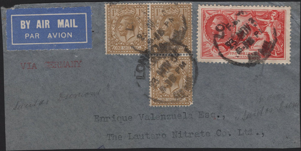• 141897 1934 PIECE SENT AIR MAIL VIA GERMANY LONDON TO SOUTH AMERICA WITH 5S SEAHORSE (SG451) AND 1S (SG429) X 3.