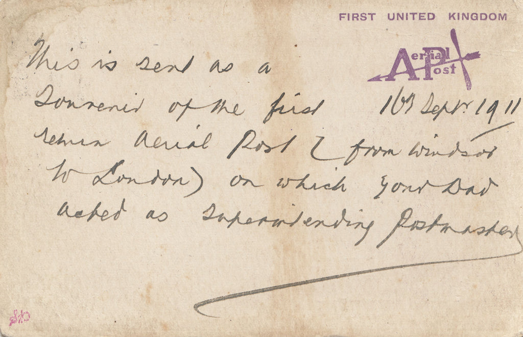 1911 FRST OFFICIAL U.K. AERIAL POST WINDSOR PRIVILEGE POSTCARD IN VIOLET TO 'B.G. ALLEN' ESSEX. A good example of the very scarce Windsor privilege postcard in violet, slight soiling, from Windsor to 'Mr B.G. Allen, 117 Elgin Rd, Seven Kings, Essex' with KGV ½d Downey cancelled fine strike 'FIRST UNITED KINGDOM/AERIAL POST WINDSOR' date stamp SP 16 1911 Die 2. A well known card from a Mr J Allen to his son with message on reverse 'This is sent as a Souvenir of the first ever Aerial Post (from Windsor to London) on which your Dad acted as Superintending Postmaster'. (Ref 141484).