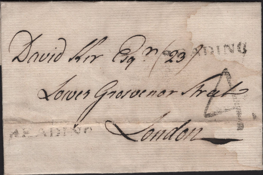 1795 MAIL READING TO LONDON WITH 'READING' STRAIGHT LINE HAND STAMPS (BR314) AND HAND STAMP '4' (BR40) AS APPLIED TO MAIL READING TO LONDON. Letter from Reading dated 22nd March 1795, some soiling, to London, on front two good strikes 'READING' straight line hand stamp in black (BR314) and fine strike hand stamp '4' in black (BR40) applied to mail Reading to London that was charged 4d, this hand stamp only recorded 1792-1796. (Ref 141724).