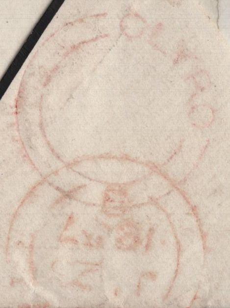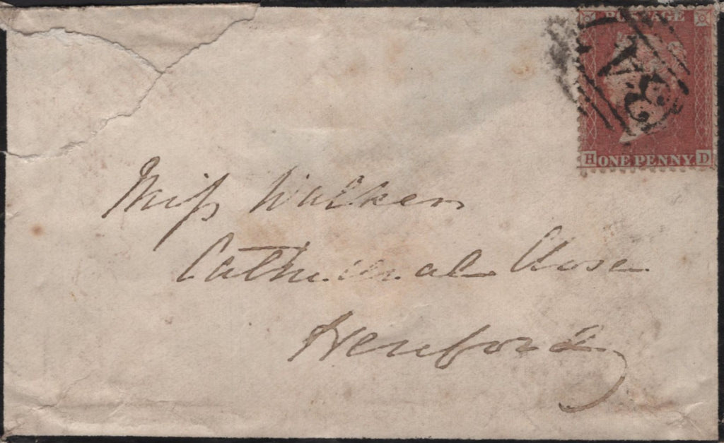 1857 MAIL HAY ON WYE , BRECON TO HEREFORD 1D (SG29) 'CLYRO' UDC IN RED. Mourning envelope, some faults, from Hay on Wye to 'Mifs Walker, Cathedral Close, Hereford' with Die 2 1d red-brown on blued paper (SG29) lettered HD tied fine strike '347' numeral of Hay. On reverse light strike 'CLYRO' udc in red and date stamp JA 23 1857. (Ref 142075).