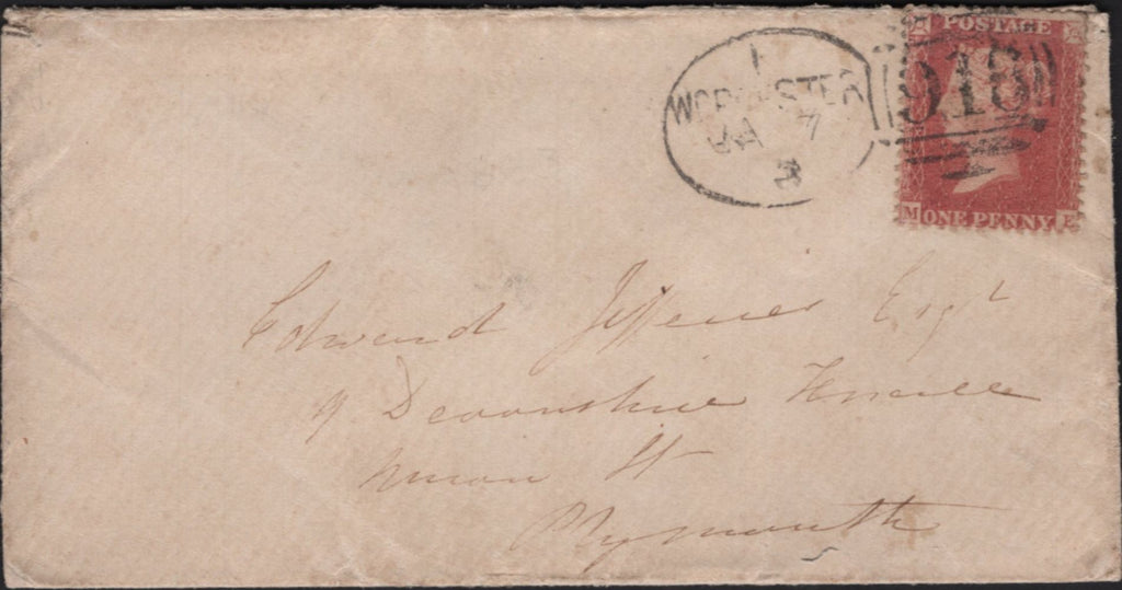 1863 MAIL WORCESTER TO PLYMOUTH WITH 'WORCESTER/918' SPOON SECOND RE-CUT (RA129). Envelope Worcester to Plymouth with Die 2 1d rose-red on white paper reserve plate 17 (SG40) lettered ME showing broad 'M', tied light strike 'WORCESTER/918' spoon second re-cut (RA 129) JA 7 63 code 'I'. (Ref 142102).