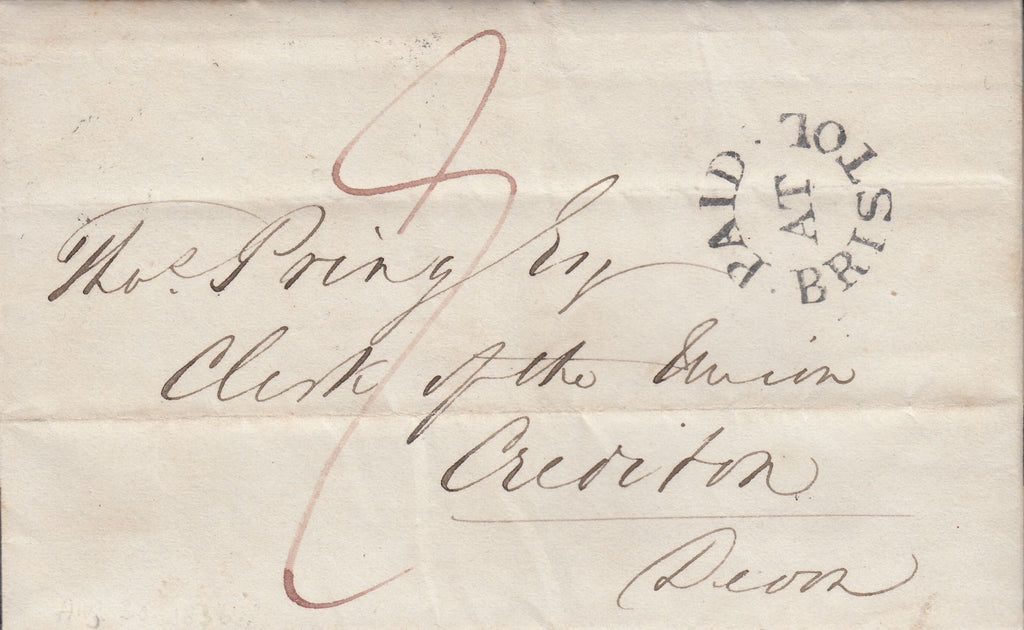 1836 "PAID AT BRISTOL" HAND STAMP (BS162) TO DEVON. Letter Bristol to "Thos. Pring Esq Clerk of the Union Crediton Devon" dated 10 August 1836, charged "9" and on front very fine strike of the circular "PAID/AT/BRISTOL" hand stamp in black (BS162). Filing fold affects hand stamp. On reverse BRISTOL date stamp AU 10 1836. (Ref 114582).