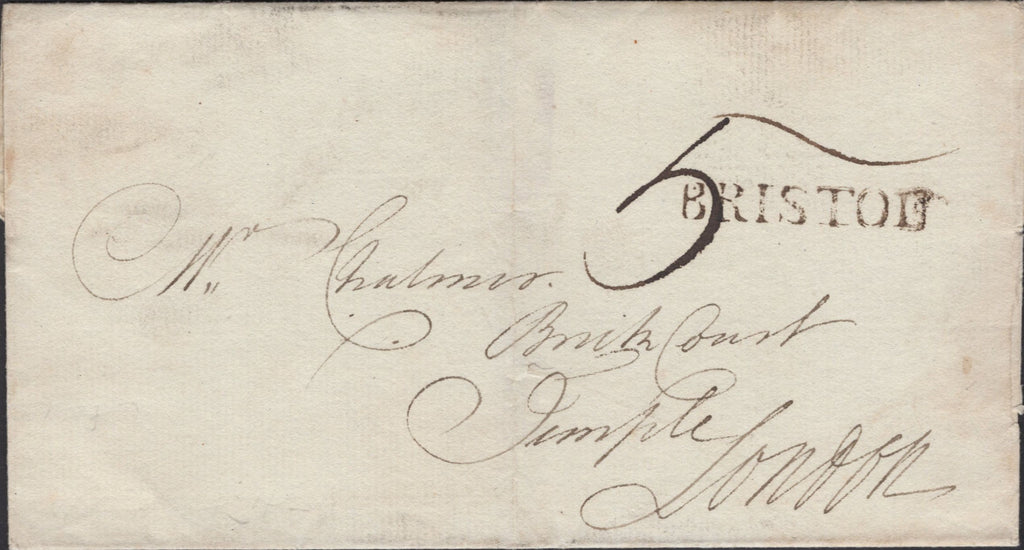 1787 MAIL BRISTOL TO LONDON WITH 'BRISTOL' STRAIGHT LINE HAND STAMP. Wrapper from Bristol dated 1st May 1787 to 'Mr Chalmer, Brick Court, Temple, London', (Queen Anne's Bounty), charged '5' and on front fine to very fine strike 'BRISTOL' straight line hand stamp in black. Within manuscript reference to the curacy of Butcombe. (Ref 139359).