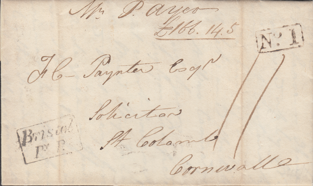 BRISTOL. 1822 entire Clifton to St Columb, on front good strike boxed "No1" receiver's handstamp of Hotwells and boxed "Bristol/Py P." handstamp (BS140). (Ref 86799).