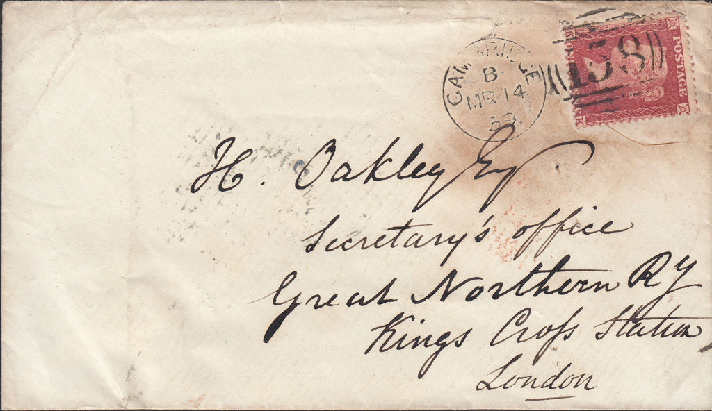CAMBS. 1859 envelope (some soiling) Cambridge to Kings Cross Station, London with SG40 lettered KK tied CAMBRIDGE duplex MR 14 59. On reverse good strike TRUMPINGTON-ST udc in dark blue. (Ref 87526).